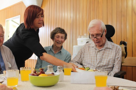 The atmosphere at Cashmere home was lovely and calm. The residents in the lunchroom were happy, relaxed, and well attended by all the staff, despite their very different needs. After Jan was done serving, she sat for lunch with a table of chatty residents. Margaret was visiting her husband John, just like she has every day since his stroke. “He never came home from the hospital. He went straight into care…. I wouldn’t have been able to cope at home.” John and Margaret lived a very full life and are still interested in current affairs like caregiver pay and the union movement. The other night they went out, with the help of staff, to a classical concert. They chose Cashmere because of the positive feel, only possible because of the constant attention of the carers. Their care for John has allowed Margaret to not worry so much and keep her own independence.
